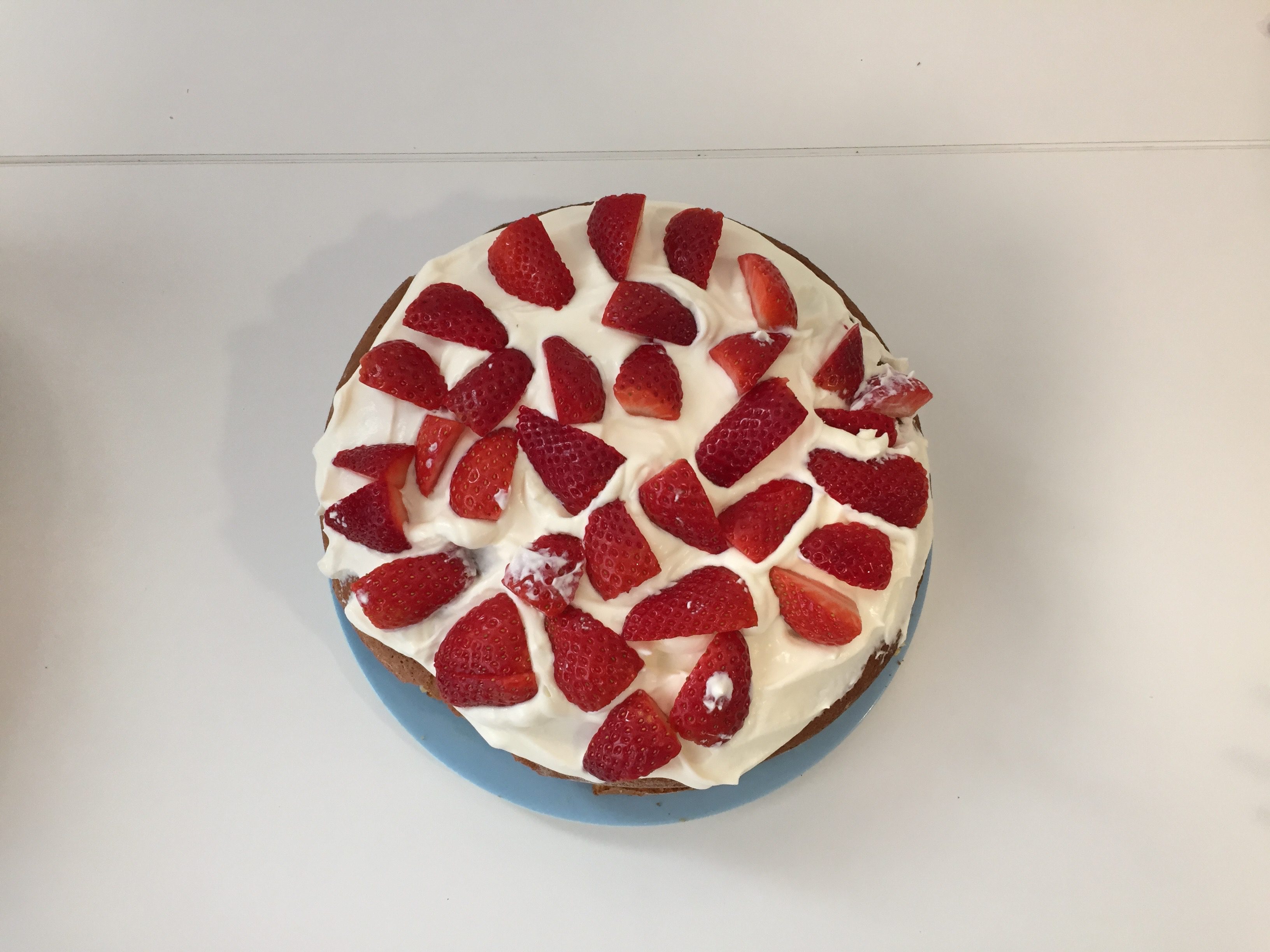 Hoy aprovechando la onomástica de H os traigo nuestra tarta favorita!! Y también la más fácil de hacer! Es la tarta de fresas! Es muy sencilla. Yo lo que hago es hacer el bizcocho con la típica receta del vasito de yogur. Una vez está atemperado preparo: