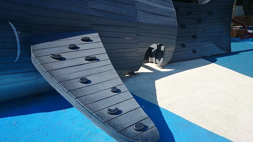 El tiburón era una grandísima estructura para que los niños treparan y escalaran y desembocaba en un tobogán. De la misma manera el barco era la mitad de un enorme barco pirata con su timón, sus barriles,… no le faltaba detalle. El suelo del parque estaba acondicionado para los peques, era este material de corcho blando por si se caen que no se hagan daño. Muy bien cuidado y diseñado.